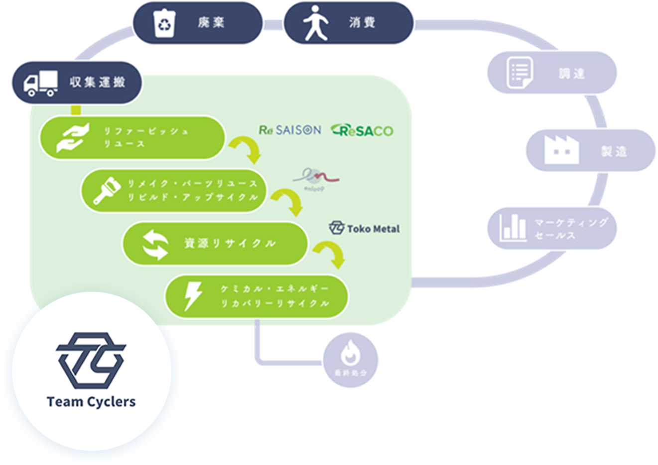 当グループでは、当初から営んでおりました、東港金属のリサイクル事業を高度化し、資源を生み出すだけではなく、グループとして、リユース、リファービッシュといったより環境負担が少ないサービスから、新たな価値を見出すリメイク事業などを展開、物流機能も持つことにより、カスケード式のリサイクルを、資源リサイクル事業として推進しています。