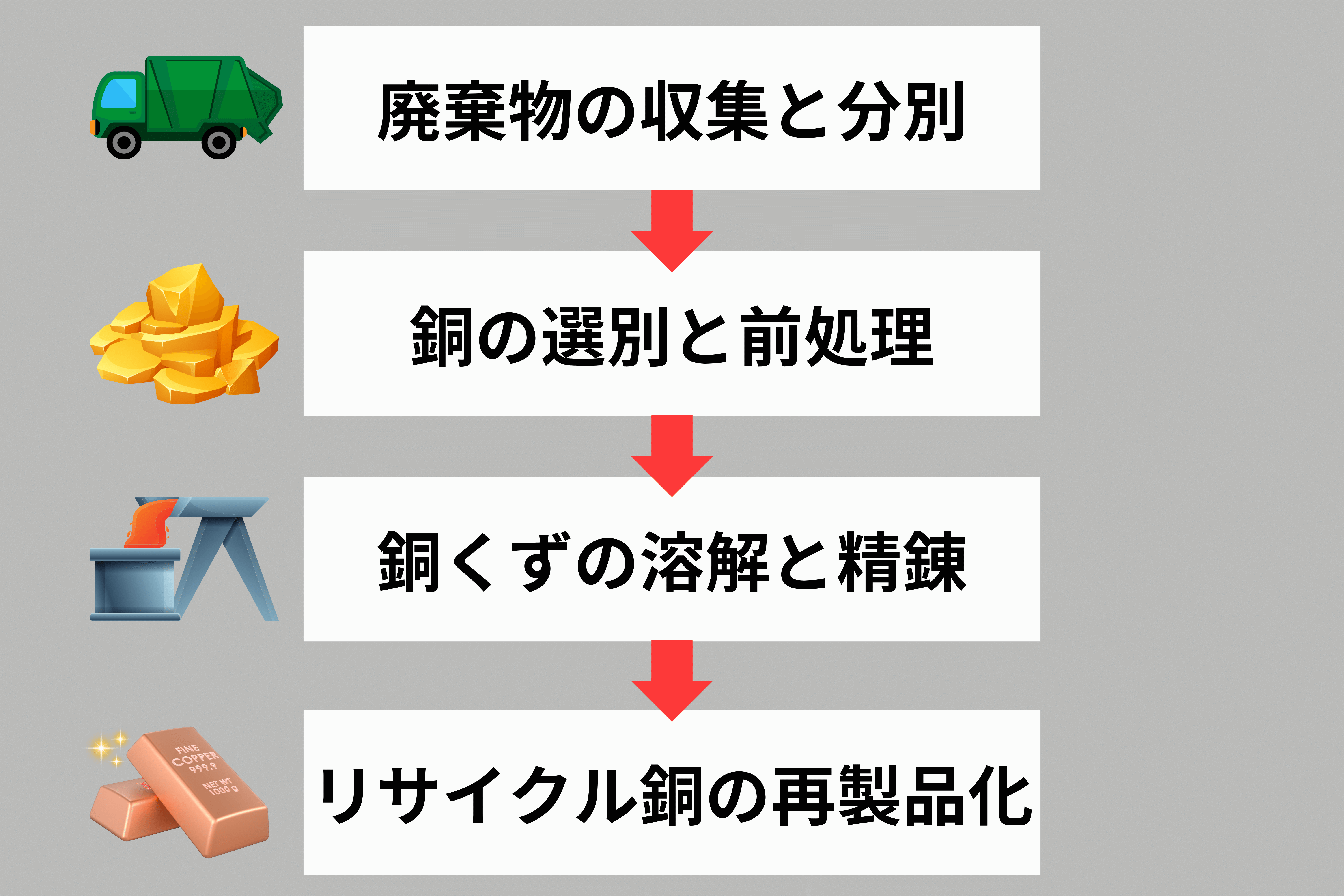 一般的に、銅のリサイクルは以下のような手順で行われています。