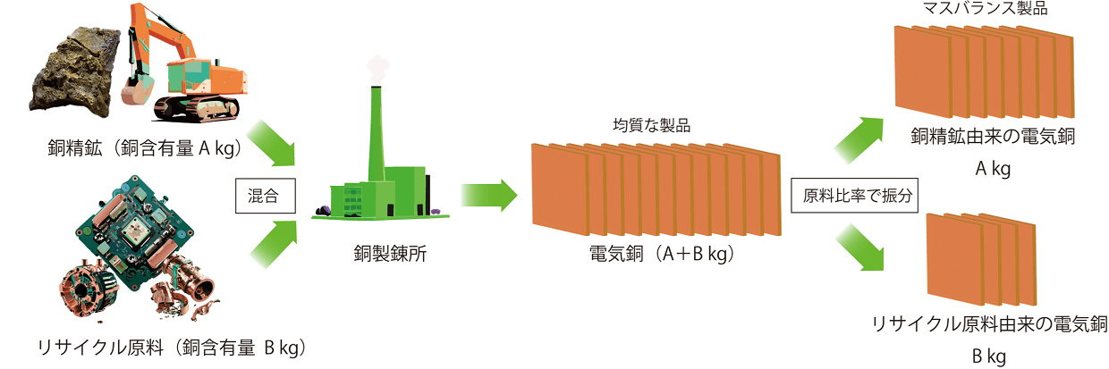 一般的に、再生材と新規材を混合して製品を製造する場合、製品ごとの再生材含有率を特定するのは困難です。しかし、マスバランス方式では、特定の期間において投入された再生材の総量と製品への割り当て量を会計的に管理することで、「100%リサイクル由来」と認定された電気銅を供給できます。