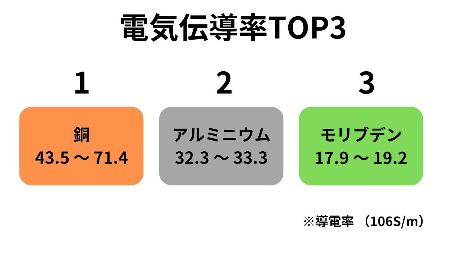 銅は銀に次ぐ電気伝導率の高さを誇り、金属の中では銀>銅>金>アルミニウムの順に高い熱伝導率を持ちます。