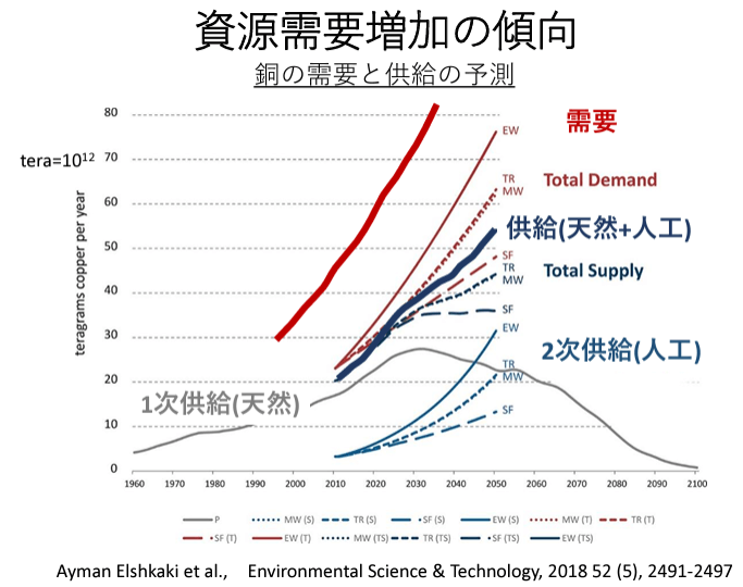銅は地殻中の存在量がクラーク数25位(0.01%)※2と希少金属に分類されるため、三菱総合研究所の分析では、埋蔵量から見て今後50年間でリサイクルを含めても供給量に限界が来ると予測※3されています。このため、銅の循環利用は資源枯渇対策として極めて重要です。
