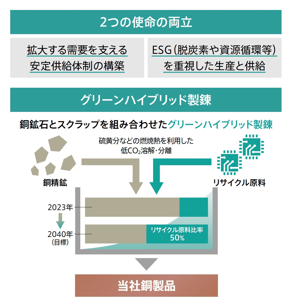 日本ではJXが銅のリサイクルにおける主導的な役割を果たし、リサイクル原料の割合を現在の14%から2040年に50%まで引き上げる目標を掲げています。2020年のデータでは、世界で生産された銅半製品の28%がリサイクル材によるものでしたが、今後さらに高い目標が求められています。
