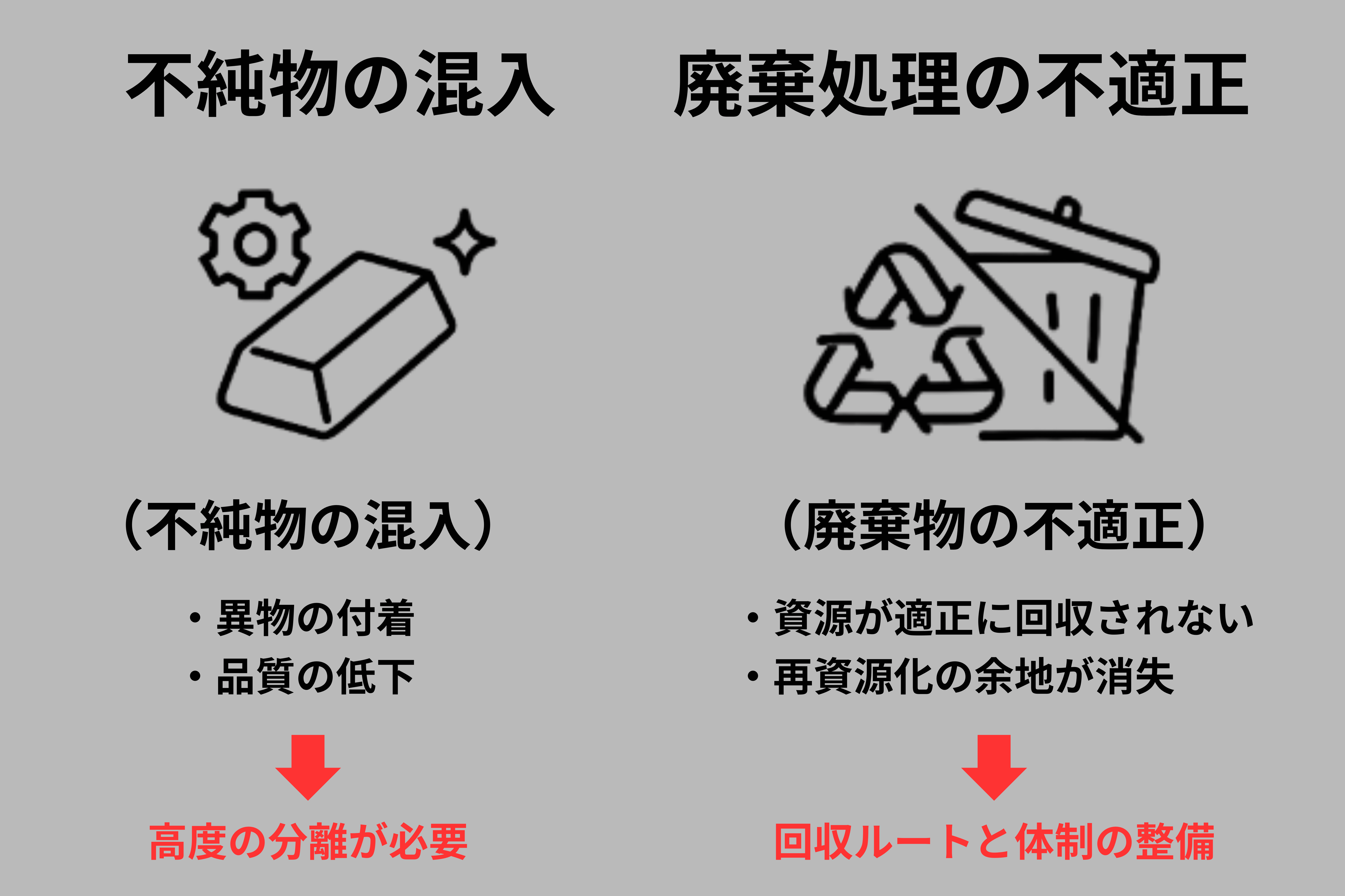 こうした不適切な処理は、回収率の低下だけでなく、環境汚染のリスクも伴います。例えば、電子機器に含まれる有害物質が埋め立てによって土壌や地下水を汚染する可能性も指摘されています。