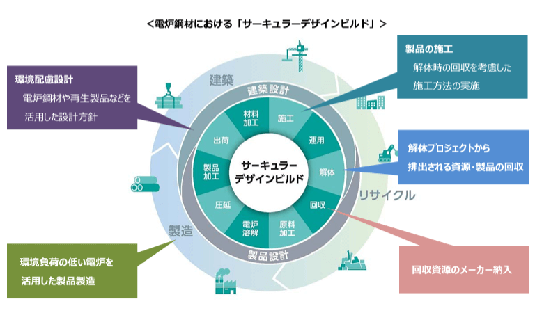 竹中工務店が東京製鐵、巖本金属、岸和田製鋼、共英製鋼の5社で連携し、建築における電炉鋼材を活用した鉄スクラップ循環サイクルの全体最適化を目指すプロジェクト です。