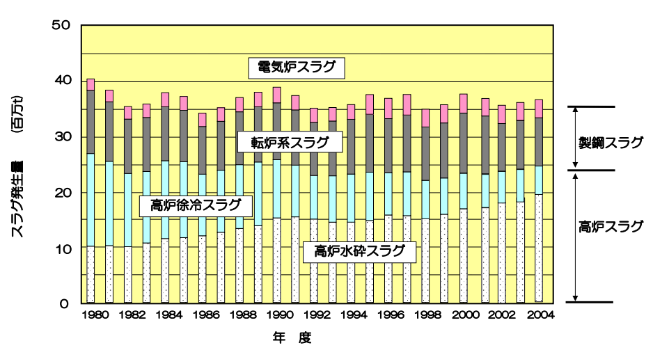 上記のグラフは、1980年から2004年にかけての鉄鋼スラグ発生量の推移を示したものです。スラグは大きく分けて高炉スラグと製鋼スラグに分類され、それぞれに含まれる種類も異なります。