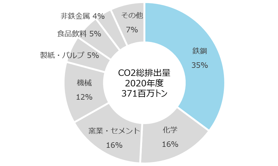 2023年時点で鉄鋼業界が排出する二酸化炭素量は日本の二酸化炭素排出量全体の約35%を占めるといわれており、製造業のなかでも高水準にあります。