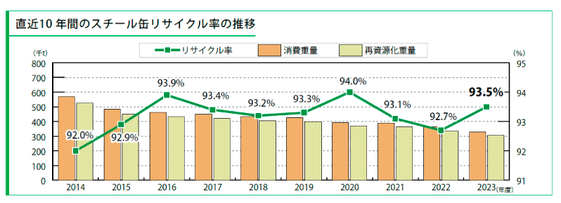スチール缶については、スチール缶リサイクル協会の統計によると、2023年度のスチール缶リサイクル率93%以上を達成しており、12年連続で90%を超える高水準を維持しています。これは磁力選別による効率的な回収システムと、製鋼原料としての安定した需要によるものです。