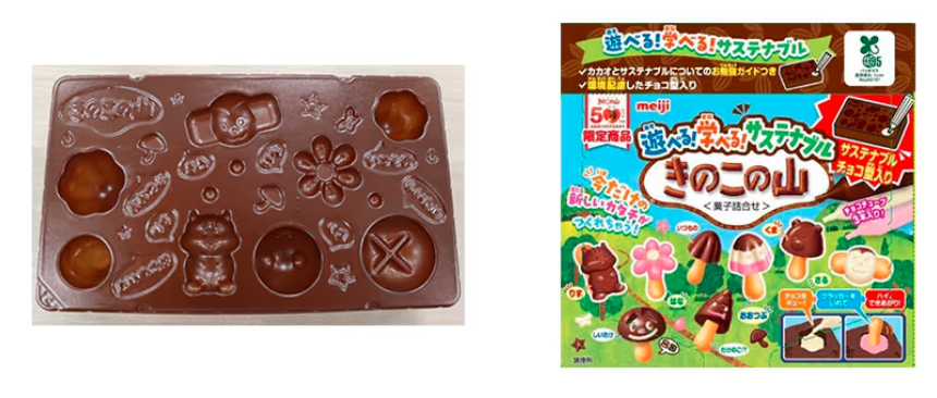 明治は、チョコレート菓子「きのこの山」の50周年記念商品として、カカオハスク由来のバイオプラスチック素材を95%使用したトレー(ハスクトレー) を採用した「遊べる!学べる!サステナブルきのこの山」を2025年7月に期間限定で発売しました。