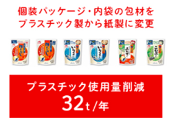 包装材の紙化やプラスチック使用量の大幅削減を実現しています。たとえば、プラスチック廃棄量を年間で約12トン削減、小分けにされたスティック製品では32トン削減するなどの成果を挙げています。