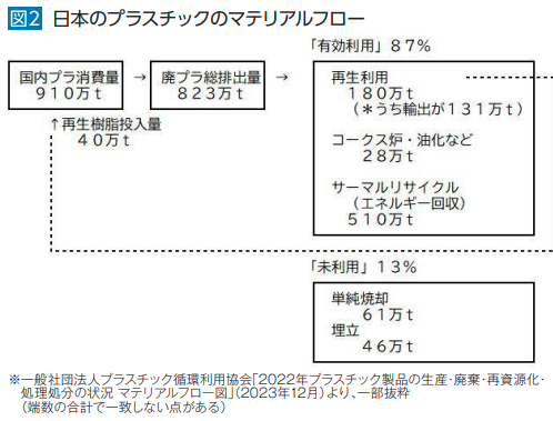 日本では、プラスチック資源循環促進法(プラスチック新法)が2022年に施行されたものの、法律実施後の廃プラスチック排出量は2021年と比べてほとんど減少しておらず、最後には再資源化率の内訳で「サーマルリサイクル(焼却による熱回収)」が大多数を占めていることが示されています。