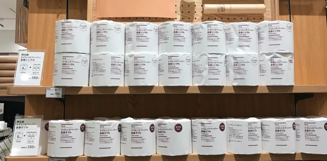 無印良品が販売するトイレットペーパーは、原料に再生紙を使用し、さらに他社製品と比べて巻き長を約5倍に伸ばした 「超長巻」 ロール(250m)です。