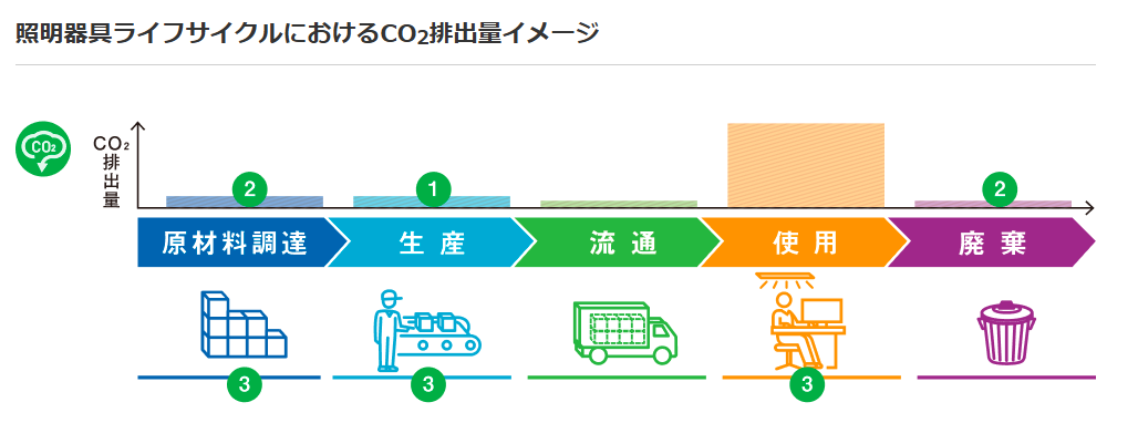 加えて、iDシリーズには輝度あたりの効率が非常に高い「環境特化型ライトバー」が用意されており、例えば205.9 lm/Wという業界最高クラスの高効率設計のライトバーが採用されており、高効率化設計により、照明器具のライフサイクル全体で最もCO₂排出量が多くなる製品使用時の電力消費を大幅に削減できる点が大きな特徴です。