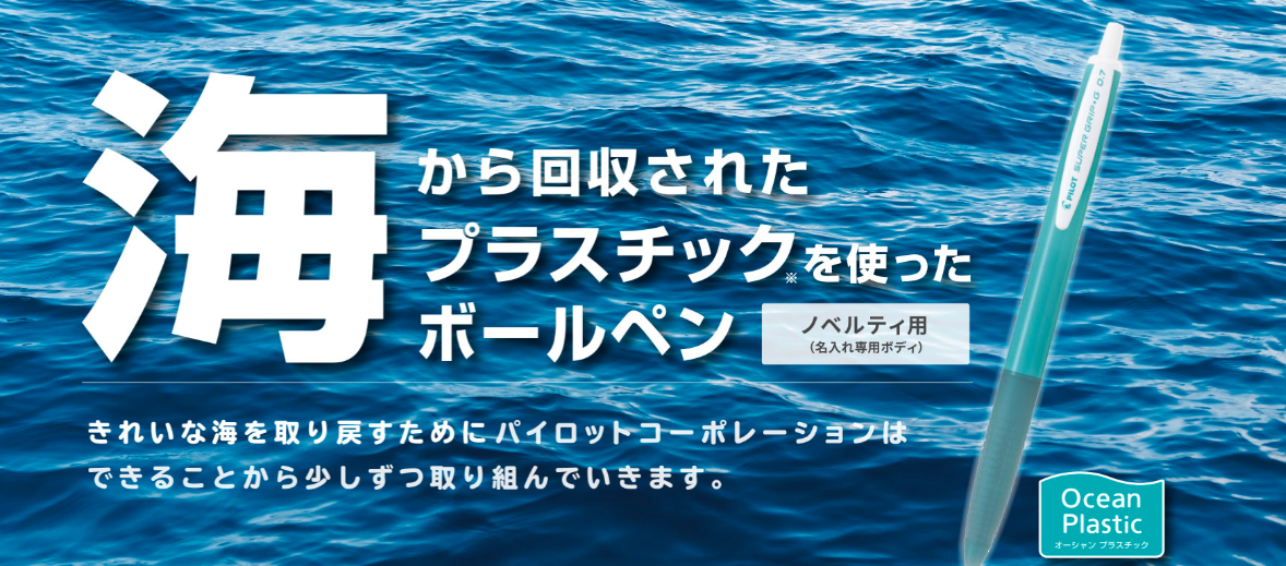 パイロット社は、海洋から回収されたプラスチックごみを再生樹脂の原料として活用し、オーシャンプラスチックシリーズのノベルティ用ボールペンを展開しています。