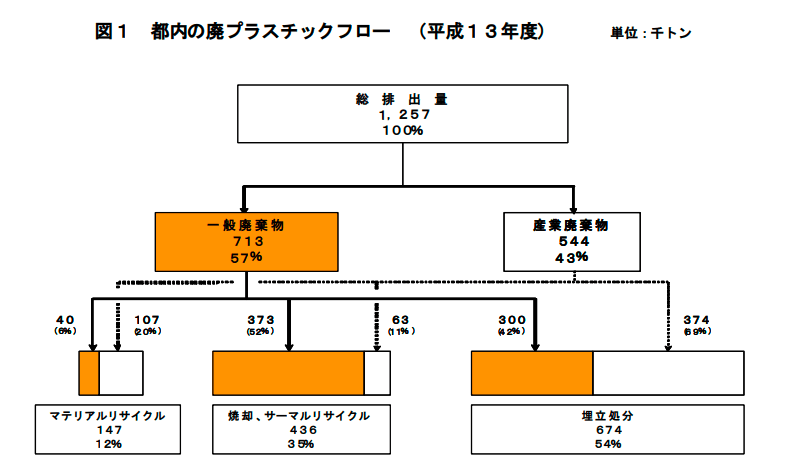 また東京都の調査によると、平成13年度には125万トンのプラスチック廃棄物が排出され、そのうち6%のみがマテリアルリサイクルされていました。残りは異物混入や複合材質での分別困難により、42%が埋立処分、52%が焼却やサーマルリサイクルに回されています。