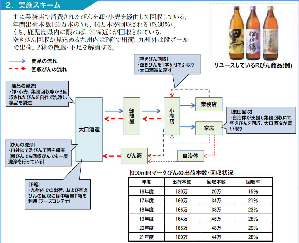 環境省の実証事業を契機に、行政やびん商、酒造メーカー、酒類販売店、びんメーカーが委員会を立ち上げ、リユース向けの900ml規格統一Rマークびんを設計しました。