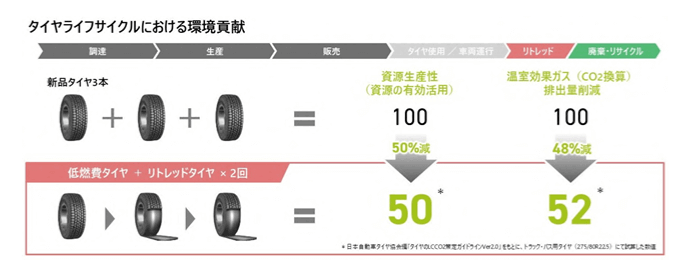 さらに、すり減ったタイヤを再生ゴムで補修するリトレッド技術を活用することで、タイヤ1本あたりの資源使用量を最大50%削減、CO₂排出量を48%削減できると試算されています。
