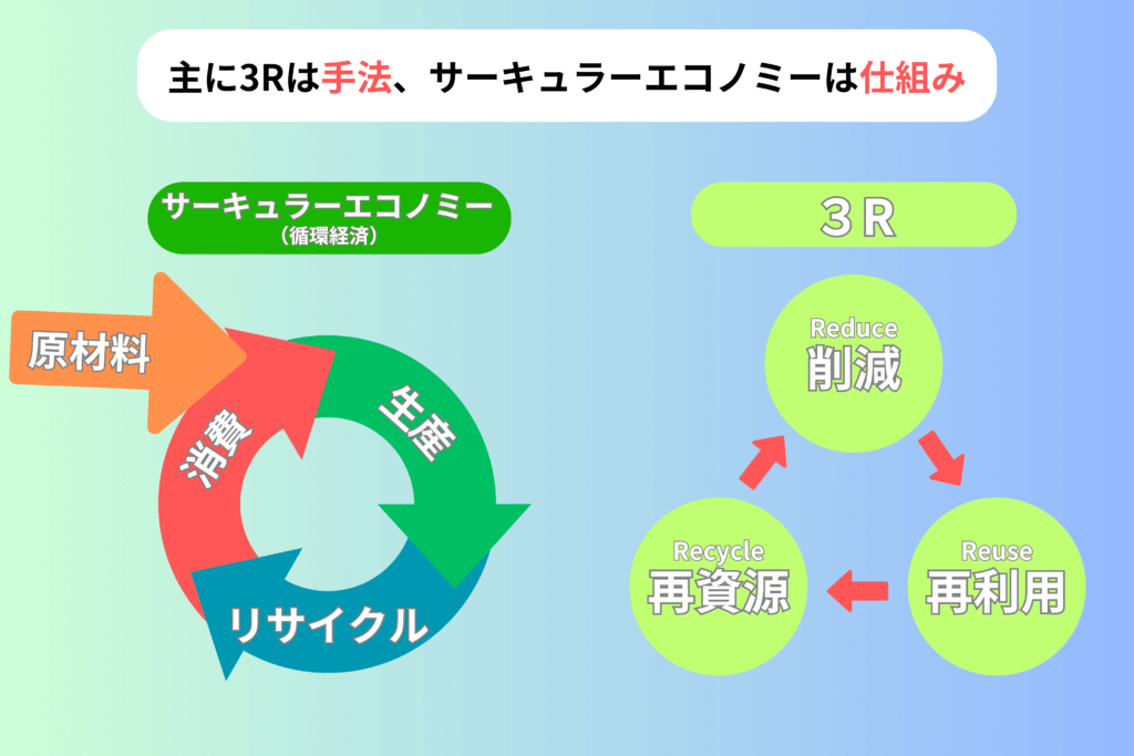 一方で、3Rはすでに存在する製品や資源に対して、どのように再利用・削減・再資源化していくかという“手法”に焦点を当てた取り組みです。