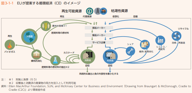 EUでは、世界人口の増加経済成長に伴う課題として、資源消費量の増加資源需給の逼迫(ひっぱく)する将来を見据えて従来の産業の在り方を見直すことで新たなビジネスチャンス持続的な体制の構築を目指しています。