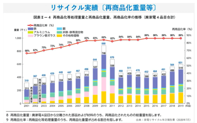 製造事業者などがリサイクル技術の向上や環境に配慮した設計指針の取り決めなどに取り組んだことにより、家電リサイクル率(再商品化率)が向上しています。