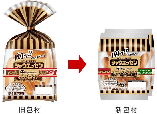 日本ハムでは主力ウインナー商品の包装形態を従来の巾着型からエコ・ピロへ変更することで宝蔵資材重量を28%削減しました。