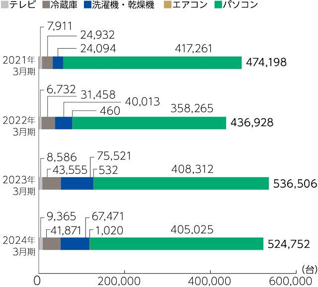 2024年3月期には、テレビ・冷蔵庫・洗濯機・乾燥機・エアコン・パソコンをあわせて約52万台のリユース家電を販売しています(図④)。