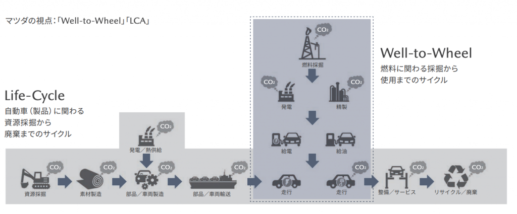 マツダは、車両の製造から使用、廃棄・リサイクルまでを対象にライフサイクルアセスメントを実施し、車種や駆動方式ごとのCO₂排出量を比較しています。内燃機関車と電気自動車について、地域ごとの電力構成や走行条件を踏まえて評価した結果、ライフサイクル全体での環境優位性は使用環境によって変化することが明らかになりました。