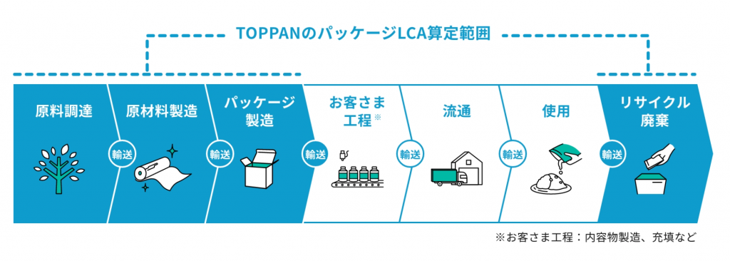 TOPPANは、軟包装・紙器・プラスチック成形品を対象にライフサイクルアセスメントでパッケージのライフサイクル全体のCO₂排出量を算定し、素材変更や設計変更の効果を根拠付きで提案しています。