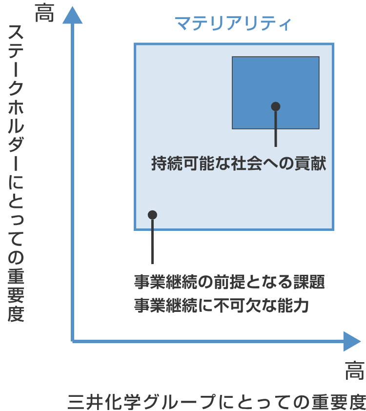 | 優先順位付けと特定 | ステークホルダーにとっての重要度と三井化学にとっての重要度の両軸で評価し、優先順位を決定ESG推進委員会や経営会議、取締役会で議論し、最終的なマテリアリティを特定 |