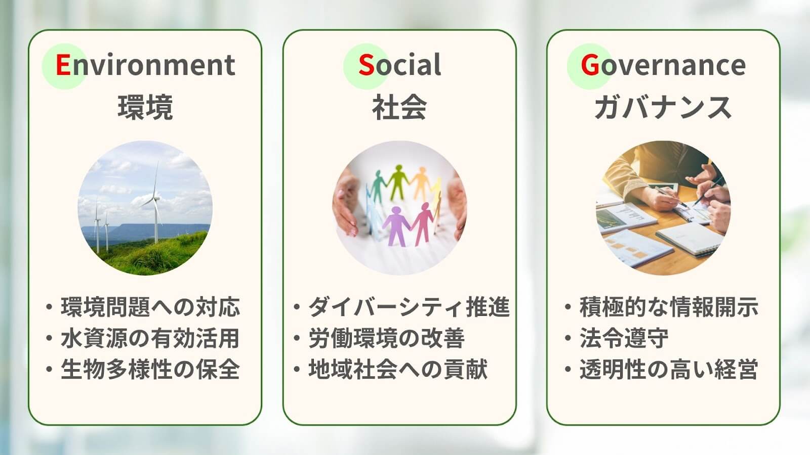 次第に機関投資家を中心としてESGの視点を取り入れた投資が広まり、企業の経営方針にも大きな影響を与えるようになっています。以下で3つの要素について、それぞれ解説します。