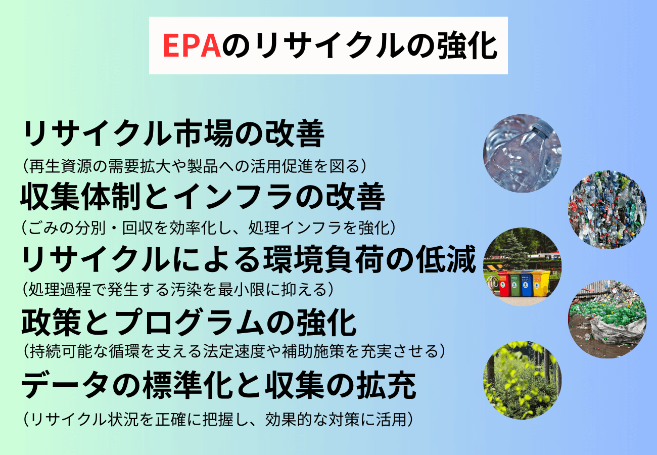 アメリカでは、環境負荷の軽減と資源循環の促進を目的に、2021年11月に米国環境保護庁(EPA)が上記の図の5つの目標を中心とする「国家リサイクル戦略(National Recycling Strategy)」を発表しました。この戦略では、2030年までに固形廃棄物のリサイクル率を50%に引き上げることが目標とされています。