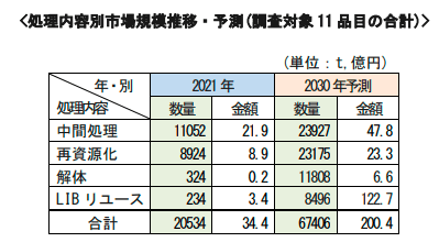 静脈産業の市場規模に関して、株式会社グリーンビジネス研究所の「LIB(リチウムイオン電池)の静脈産業市場動向実態調査」が参考になります。以下の図は、静脈産業における処理内容別の市場規模推移と2030年の予測を示したものです。