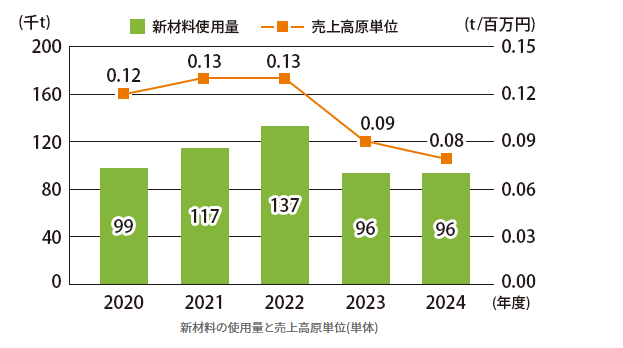 以下の図では、再生ポリプロピレンを100%使用した製品を開発するなどで再生材の使用量を増やし、新材料の使用量を減らしたことを示しています。