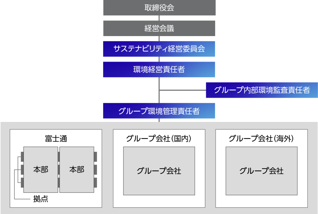 富士通株式会社では、環境負荷軽減を抜本的な変革によって達成すべき経営テーマと位置づけており、移動に伴うCO2排出、ペーパーレス化、エネルギー消費の最適化を同時並行で推し進めています。その実行に際して、以下の環境活動を推進する各組織を構築しています。