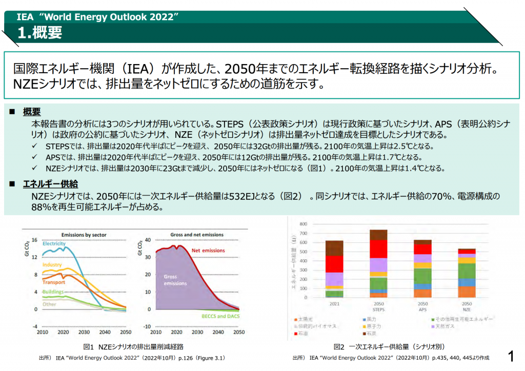 国際エネルギー機関(IEA)が示したエネルギー転換の将来像によれば、2050年の「ネットゼロシナリオ(NZE)」では、一次エネルギー供給の約70%を再生可能エネルギーが占めるとされています。
