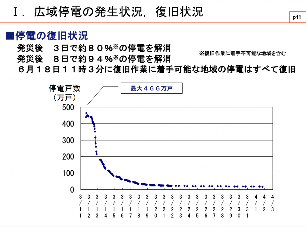 エネルギー供給の停止や不足は、企業の生産ラインや物流網に即座に影響を及ぼし、サプライチェーン全体の混乱を招くリスクがあります。実際、東日本大震災時の計画停電や、近年の電力需給ひっ迫警報は、エネルギーの安定供給が企業の操業維持に不可欠であることを再認識させました。以下のグラフは、東日本大震災時の広域停電の発生・復旧状況を表しています。