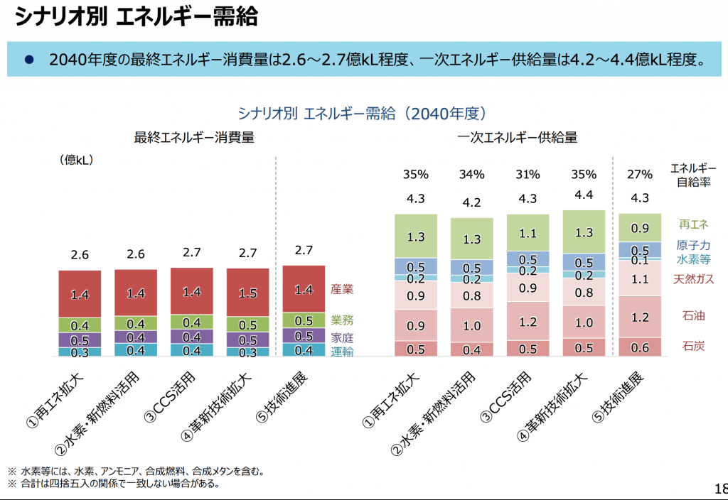 経済産業省が示す2040年度のエネルギー需給に関する複数のシナリオ分析(上の図)では、原子力・再エネ・水素・化石燃料などの構成比が異なる5つの選択肢が提示されており、それぞれエネルギー自給率や一次供給構成に大きな差があることが示されています。