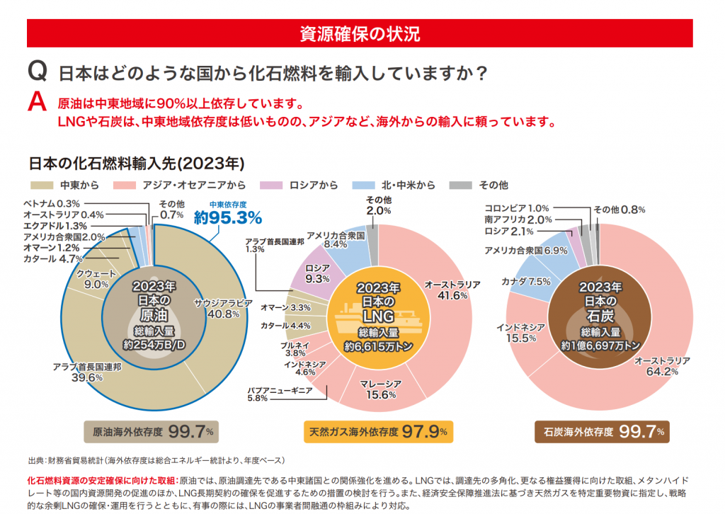2023年時点での海外依存度は、原油99.7%、天然ガス97.9%、石炭99.7%に達しており、ほぼすべての一次エネルギーを外国に頼っている状況です(上記の図)。中でも、原油は中東地域に約90%を依存しており、サウジアラビア(40.8%)、アラブ首長国連邦(39.6%)、クウェート(9.0%)といった国々に調達先が偏在しています。