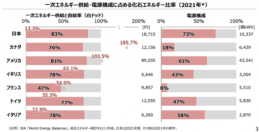 日本は、一次エネルギー供給の約83%を化石燃料に依存しており、G7諸国の中で最も高い水準となっています。また、電源構成においても化石燃料の比率は73%に達し、こちらも他国と比較して高い割合です(上の図)。