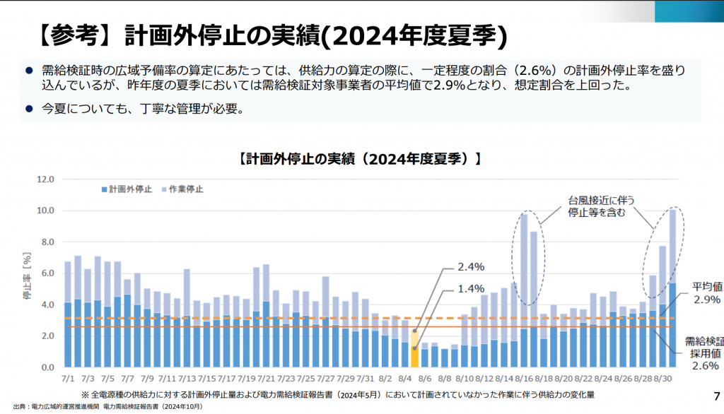 2024年度夏季の実績では、全国電源の供給力に対する平均計画外停止率は2.9%となり、需給検証で想定していた2.6%を上回る結果となりました。これは、台風接近時や設備トラブルなど、計画外の停止が供給力に与える影響の大きさを示しています。