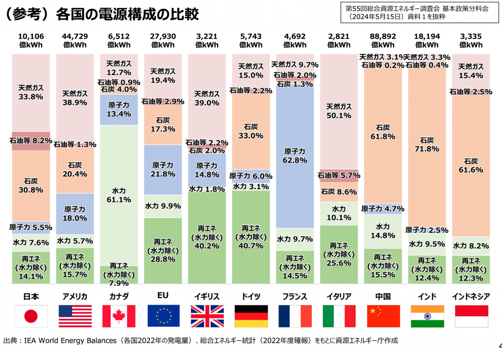 一方、石炭火力などのベースロード電源の削減が進む中、代替となる安定電源の確保が急務です。原子力や蓄電池、水素・アンモニア火力などの活用が注目されつつありますが、技術面・コスト面の課題は依然として大きいのが現状です。以下では、各国の発電構成比較をご確認いただけます。