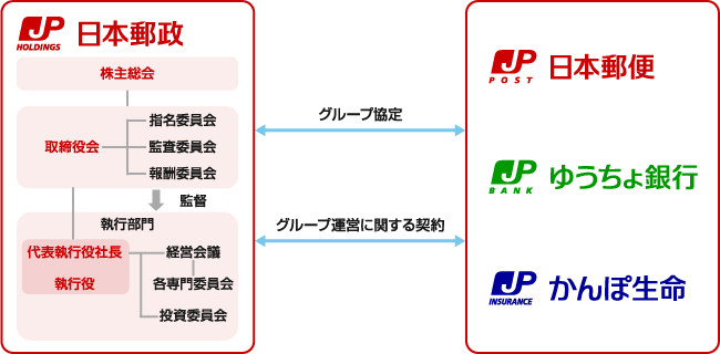 日本郵政株式会社は、持株会社としてグループ全体のコーポレートガバナンス体制を構築し、基本的な考え方として、郵便局ネットワークを通じた主要3事業のユニバーサルサービス提供による安定的な価値創出や質の高いサービス提供を追及しています。