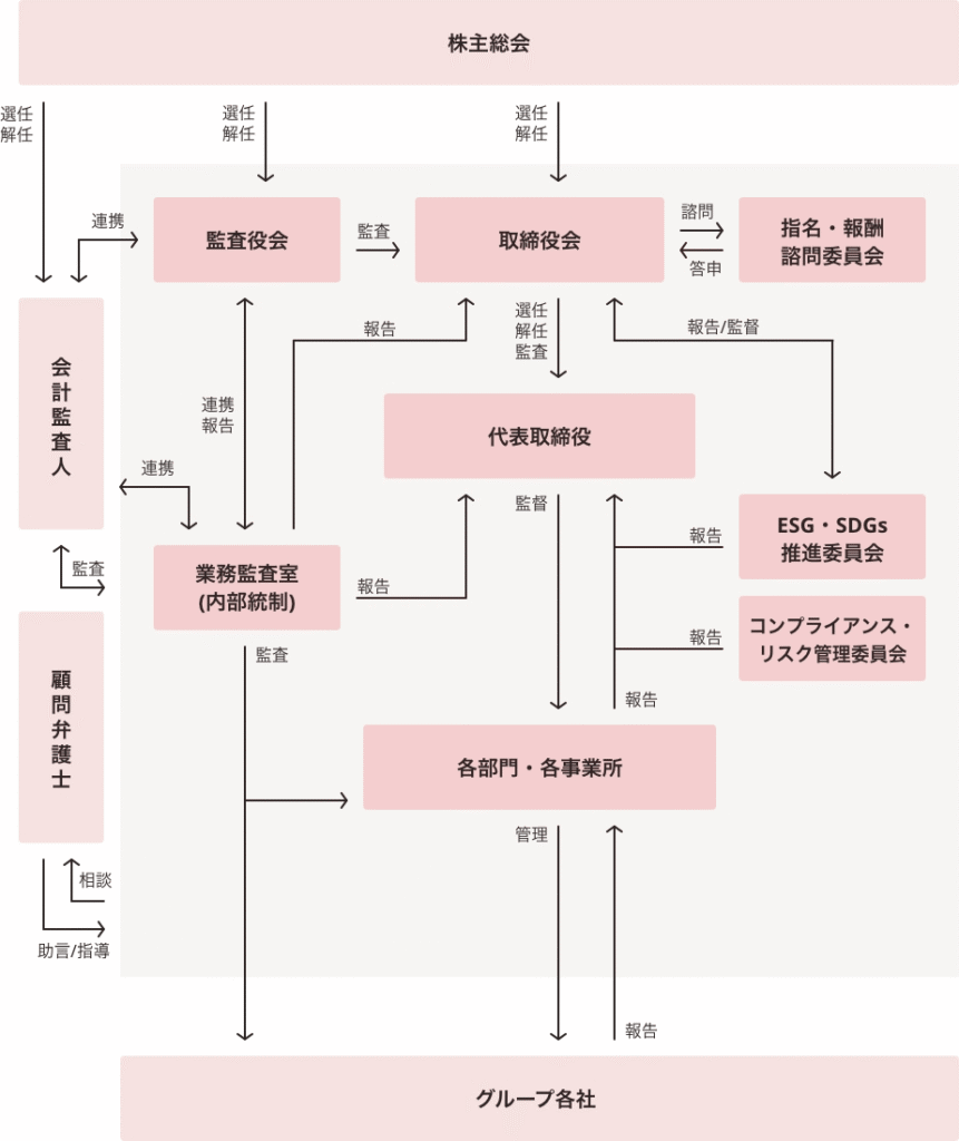 サンドラッググループは、ESGガバナンスを企業統治の中核に据えた体制を整備し、持続可能な成長社会的信頼の向上を目指しています。