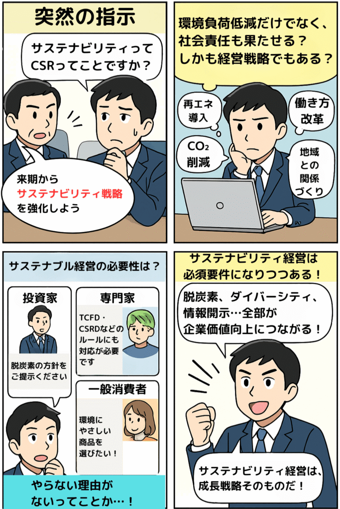 企業がグローバル市場で生き残るためには、サステナビリティ経営やESGへの対応を経営戦略の一環として組み込むことが不可欠です。