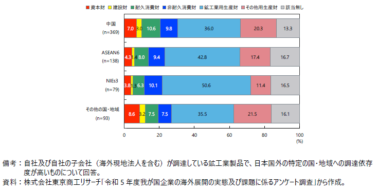 日本企業(特に製造業や卸・小売業)の海外調達先として最も依存度が高いのは中国で、約4割を占めています。続いてASEAN6、NIEs3(韓国・台湾・香港)が主要な依存先となっています。