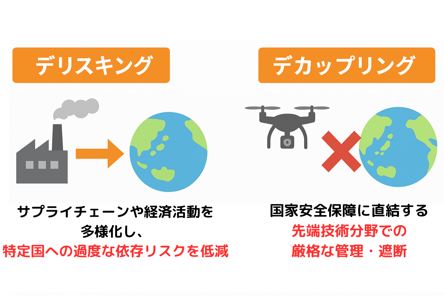 つまり、デリスキングは「リスクを制御しながら関係を維持する」戦略であるのに対し、デカップリングは「安全保障上の理由から特定分野を切り離す」対応と整理できます。