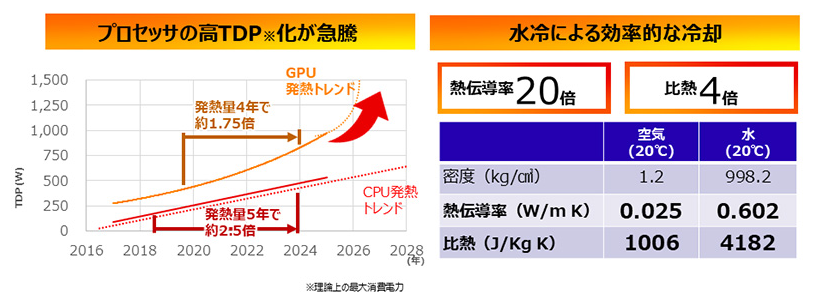 富士通は2025年4月、データセンター向けに空冷方式に比べて冷却負荷を大幅に削減できる水冷技術を核としたソリューション開発を、ハード・ソフト両面で高度化し、データセンター全体の省電力化と運用効率の改善を狙っており、従来の空冷中心のデータセンターに比べて最大で約40%のエネルギー効率改善を目指すとしています。