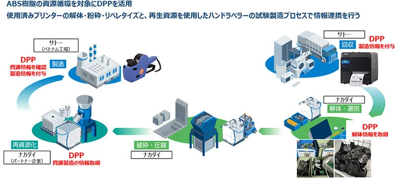 サトー製のラベルプリンターにデジタル製品パスポート用の二次元コードを付与し、製造情報・素材情報を記録し、回収・解体・破砕・再生素材の製造・再製品化工程までをデジタル製品パスポートで一貫管理し、企業横断的にデータ活用が可能かを検証しています。