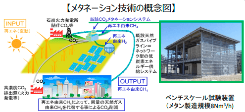 再生可能エネルギー由来のメタンを製造することで、同量の天然ガスを代替できます。 また、日本が輸入する液化天然ガス(2015年時点で8,357万トン)を100%代替した場合、約2.5億トンのCO₂削減が見込まれています。