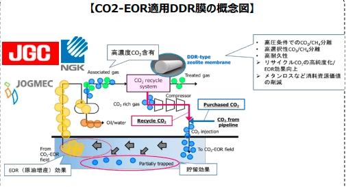 開発されたDDR膜(ゼオライト膜)は、リサイクルCO₂の昇圧動力削減、ガス分離ロスの低減、設備維持コストの削減により、プロジェクトの経済性向上に貢献すると期待されています。