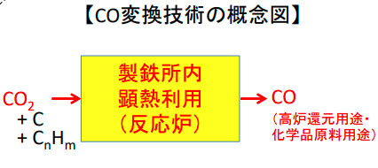 高炉では、炭素系還元ガス(COやH₂)を用いて鉄鉱石を還元する過程で、大量のCO₂が発生します。 そこで、製鉄所内の高温の顕熱や廃熱を活用し、高炉ガス中のCO₂を、Cとのブドアール反応やタールなどの炭化水素とのCO₂改質反応によってCOに変換し、高炉用還元ガスとして循環・再利用することでCO₂の排出を削減します。